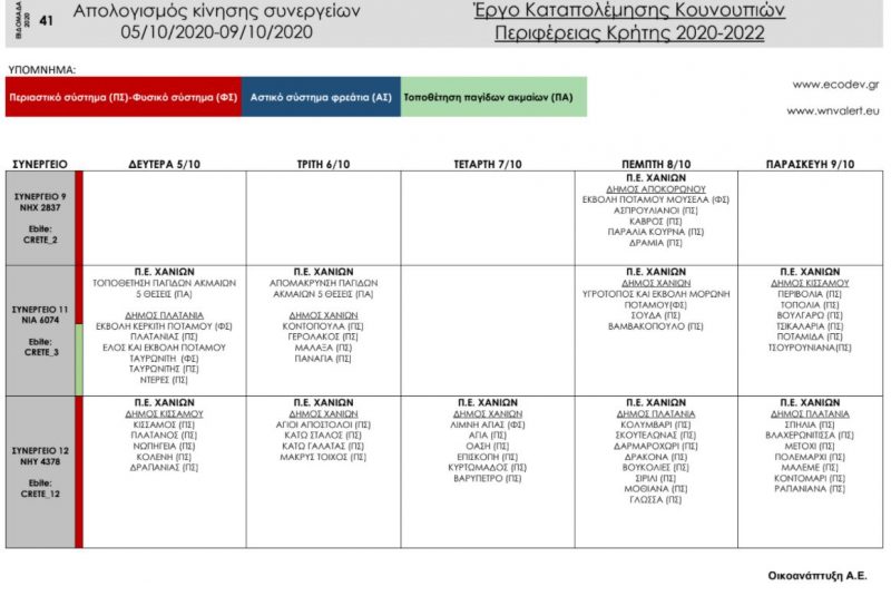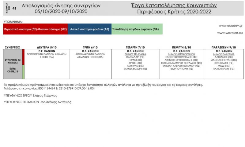 H Περιφερειακή Ενότητα Χανίων ανακοίνωσε το πρόγραμμα εφαρμογών καταπολέμησης κουνουπιών καθώς και τις περιοχές που θα κινηθούν τα συνεργεία από την Δευτέρα 5 μέχρι και την Παρασκευή 9 Οκτωβρίου.