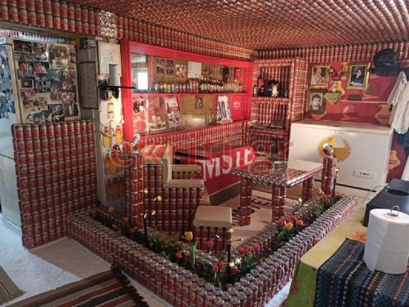 Δημιουργός του ένας Κρητικός με μεγάλη αγάπη για τη μπίρα, που αποφάσισε να αξιοποιήσει δημιουργικά τα κουτάκια μπίρας, «ντύνοντας» με αυτά ένα ολόκληρο δωμάτιο στο σπίτι του αλλά και δημιουργώντας τα πιο περίεργα και ταυτόχρονα απολύτως λειτουργικά έπιπλα. Τοίχοι, ταβάνι, πολυθρόνα, σκαμπό, ράφια, τραπεζάκι, μέχρι και παρτέρι με λουλούδια περιλαμβάνει το «καταφύγιο μπίρας», που έχει φτιάξει στο σπίτι του στην Αγία Βαρβάρα Ηρακλείου, ο κ. Μαρίνος Αποστολάκης.
