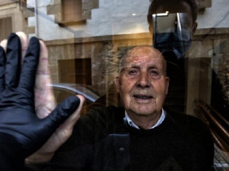 Η φωτογραφία που τράβηξε ο Ισπανός φωτορεπόρτερ Unai Beroiz, αποτυπώνει δύο χέρια, το δικό του και του 90χρονου παππού του, ενωμένα που τα χωρίζει ένα τζάμι.