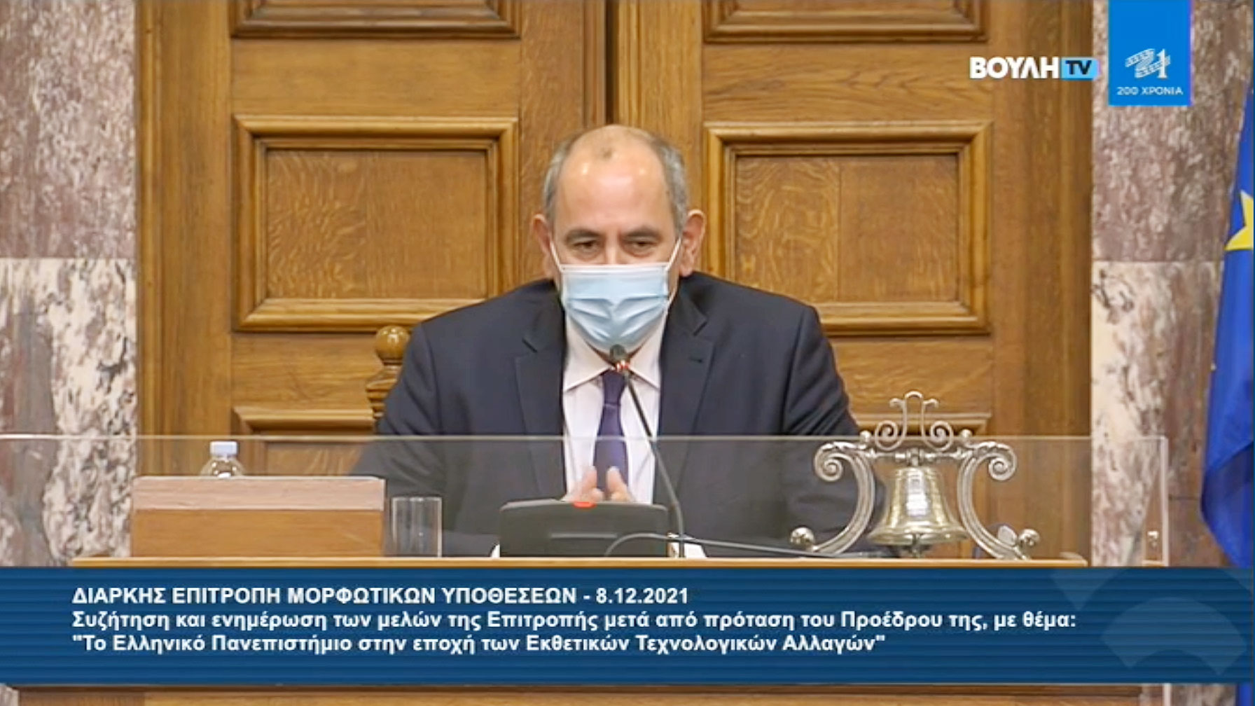 Με τη συμμετοχή του υφυπουργού Παιδείας και Θρησκευμάτων, Άγγελου Συρίγου και του γενικού γραμματέα Έρευνας και Καινοτομίας, Αθανασίου Κυριαζή, ολοκληρώθηκε χθες, Τετάρτη 8 Δεκεμβρίου 2021, η σειρά των συνεδριάσεων της Διαρκούς Επιτροπής Μορφωτικών Υποθέσεων, με θέμα: «Το Ελληνικό Πανεπιστήμιο στην εποχή των Εκθετικών Τεχνολογικών Αλλαγών», που πραγματοποιήθηκαν με πρωτοβουλία του προέδρου της Επιτροπής Βασίλη Διγαλάκη και στις οποίες συμμετείχαν εκπρόσωποι θεσμικών φορέων της ανώτατης εκπαίδευσης, του επιχειρηματικού κόσμου, της επαγγελματικής και επιστημονικής κοινότητας και της πολιτικής ηγεσίας των αρμόδιων Υπουργείων.
