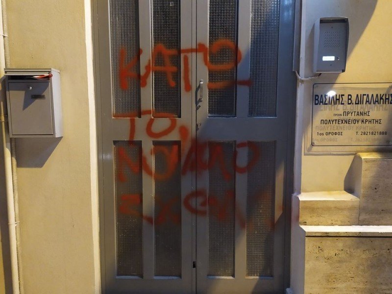 Στην πόρτα που βρίσκεται στην οδό Α. Παπανδρέου έγραψαν σύνθημα κατά του νομοσχεδίου για την παιδεία, όπως φαίνεται και στην φωτο που ανάρτησε ο ίδιος ο κ.Διγαλάκης στην σελίδα του σε μέσο κοινωνικής δικτύωσης.