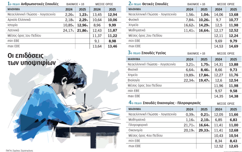 Στο 2ο πεδίο (θετικών και τεχνολογικών επιστημών) η χαμηλότερη ΕΒΕ διαμορφώνεται στο 9,79 (από 9,69 πέρυσι) και η υψηλότερη στο 14,69 (14,53 πέρυσι).