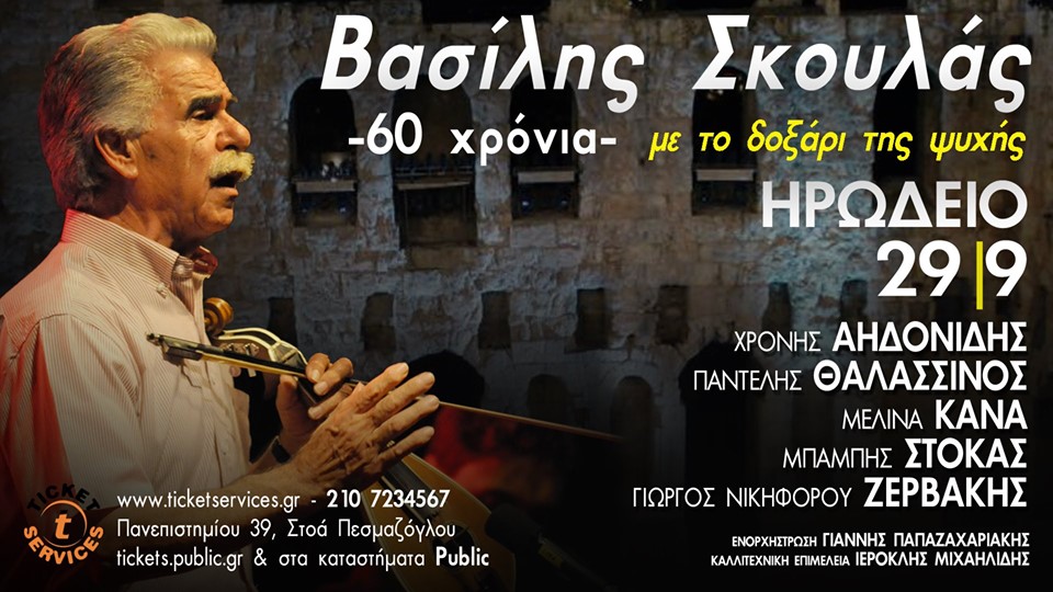 Ο ζωντανός θρύλος της Κρητικής μουσικής, ο Ανωγειανός Βασίλης Σκουλάς, γιορτάζει τα εξήντα χρόνια παρουσίας στο τραγούδι, με μια μεγάλη συναυλία κάτω από την Ακρόπολη, την Κυριακή 29 Σεπτεμβρίου.
