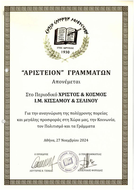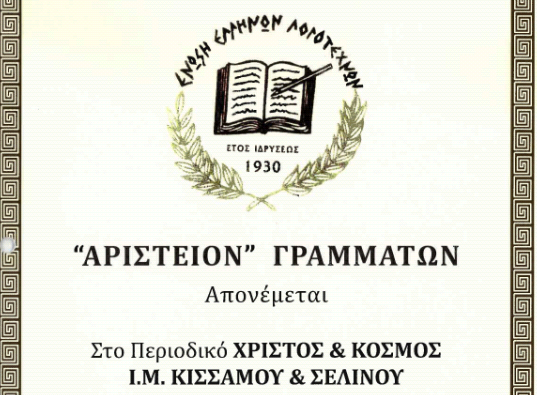 Εκ της Ιεράς Μητροπόλεως Κισάμου και Σελίνου ανακοινώνεται ότι η Ένωση Ελλήνων Λογοτεχνών απένειμε στο Περιοδικό  «Χριστός και Κόσμος» της Ιεράς Μητροπόλεως «ΑΡΙΣΤΕΙΟΝ» ΓΡΑΜΜΑΤΩΝ «… για την αναγνώριση της πολύχρονης πορείας και μεγάλη προσφοράς στη Χώρα μας, την Κοινωνία, τον Πολιτισμό και τα Γράμματα».