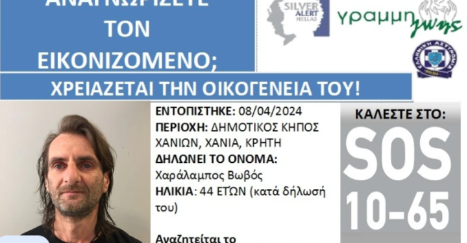 Τη Δευτέρα 8 Απριλίου ένας άνδρας εντοπίστηκε περιπλανώμενος στην περιοχή του Δημοτικού Κήπου Χανίων Κρήτης.