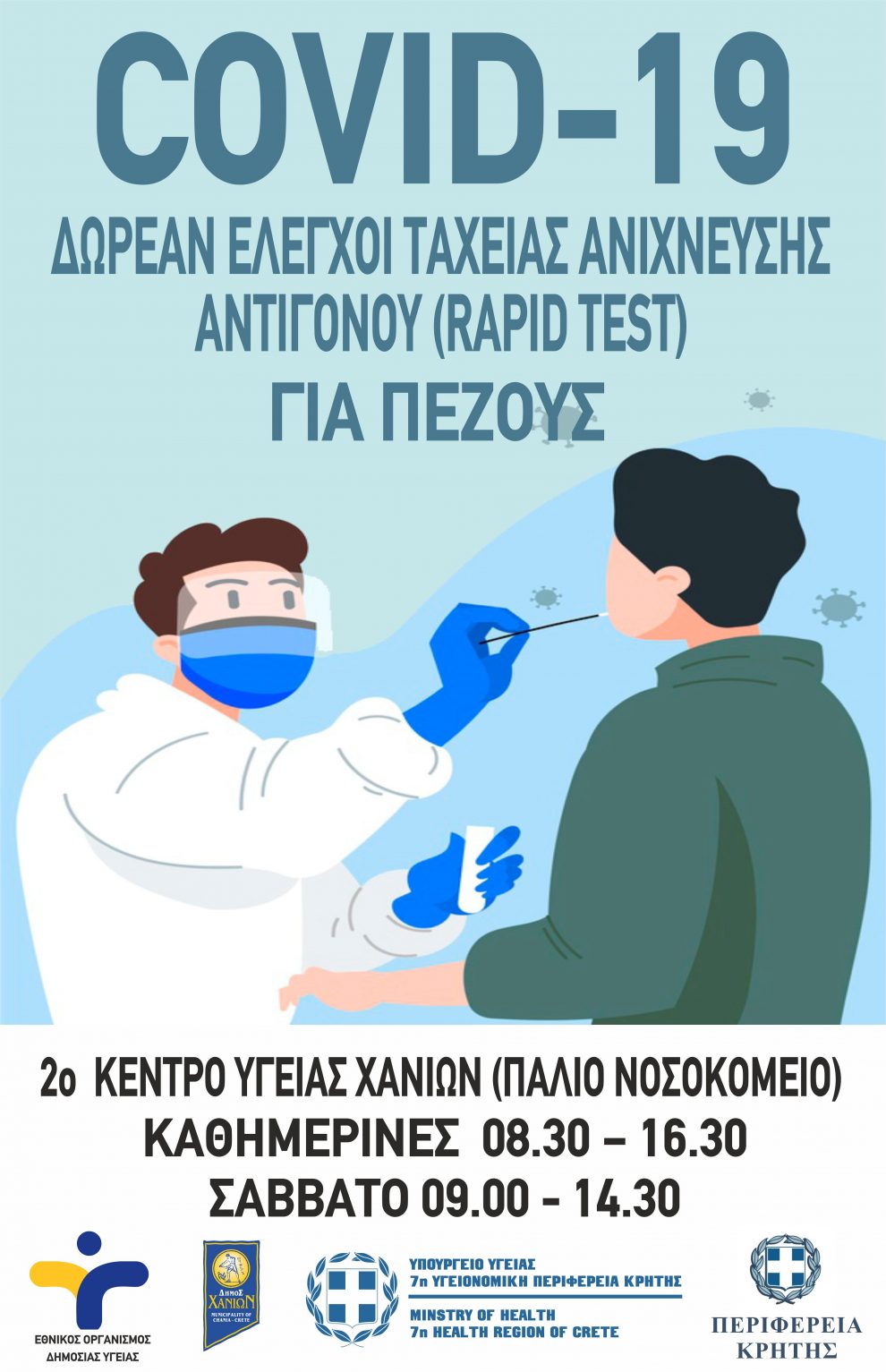 η διενέργεια των δωρεάν rapid test από το επιστημονικό προσωπικό των κινητών μονάδων του Ε.Ο.Δ.Υ. θα πραγματοποιείται στο 2ο ΚΕΝΤΡΟ ΥΓΕΙΑΣ ΧΑΝΙΩΝ – 1Η & 2Η ΤΟΜΥ (ΠΑΛΙΟ ΝΟΣΟΚΟΜΕΙΟ) σε ειδικά διαμορφωμένους χώρους (ΙSOΒΟΧ), με ωράριο