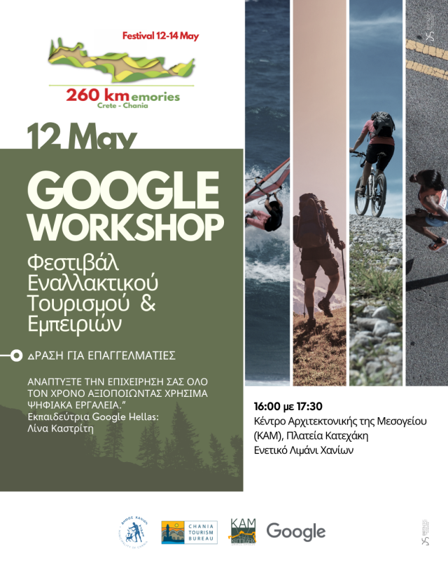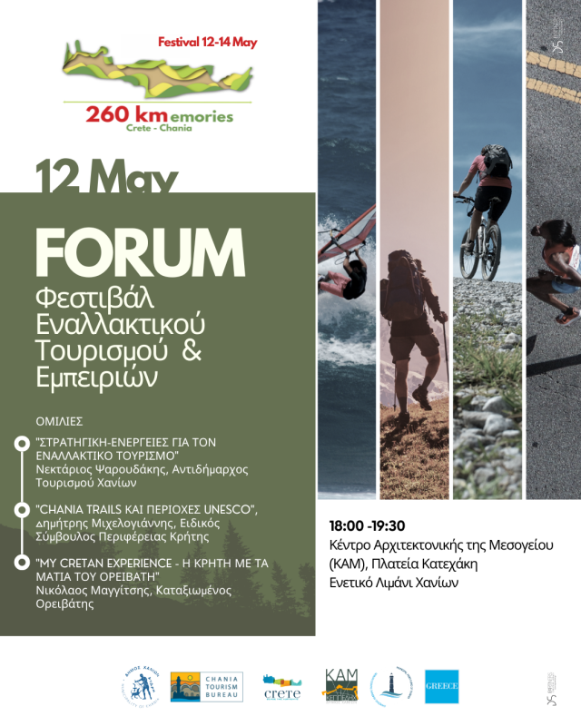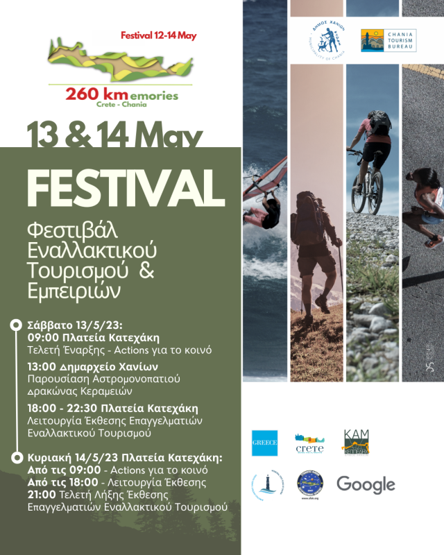 Με τίτλο 260kmemories (260 χλμ. αναμνήσεων), πληθώρα εμπειριών και εναλλακτικών δράσεων, «ανοίγει αυλαία» το 1ο Φεστιβάλ Εναλλακτικού Τουρισμού και Εμπειριών, που διοργανώνει ο Δήμος Χανίων από σήμερα, Παρασκευή 12 Μαΐου έως και την Κυριακή 14 Μαΐου 2023, με μέριμνα του Γραφείο Τουρισμού και τη συνδρομή της Κ.Ε.Π.ΠΕ.ΔΗ.Χ.-Κ.Α.Μ. και του Δημοτικού Λιμενικού Ταμείου Χανίων.