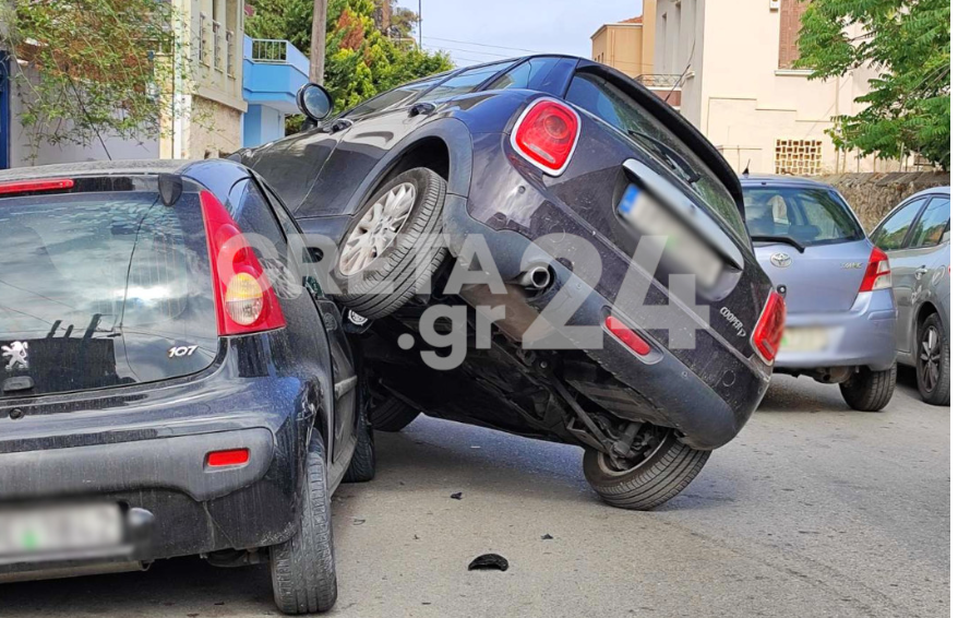 Όπως φαίνεται στις εικόνες του Creta24, ένα αυτοκίνητο «σκαρφάλωσε» σε σταθμευμένο ΙΧ.
