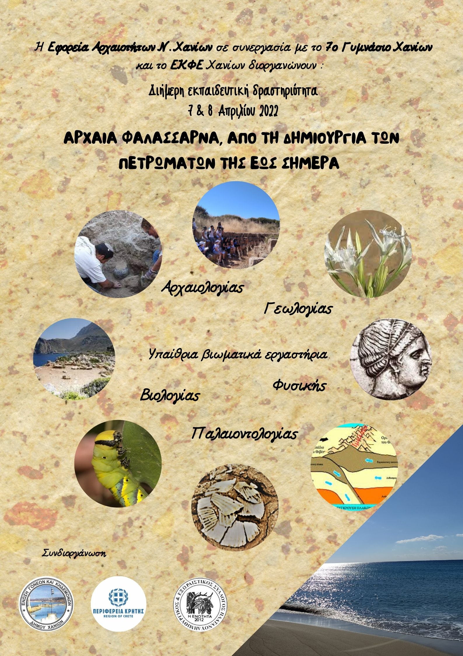 Η Εφορεία Αρχαιοτήτων Χανίων, το 7οΓυμνάσιο Χανίων, η Δ.Δ.Ε. Χανίων, και το Ε.Κ.Φ.Ε. Χανίων σε συνεργασία με την Ένωση Γονέων, διοργανώνουν διήμερη εκπαιδευτική δραστηριότητα με θέμα «Αρχαία Φαλάσαρνα, από τη δημιουργία των πετρωμάτων της, έως σήμερα».
