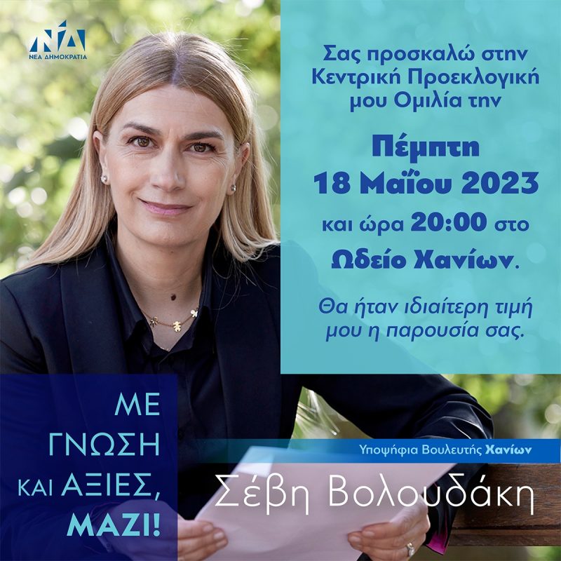 Xανιά: Αύριο Πέμπτη η κεντρική προεκλογική ομιλία της Υποψ. Βουλευτή ΝΔ Σέβης Βολουδάκη