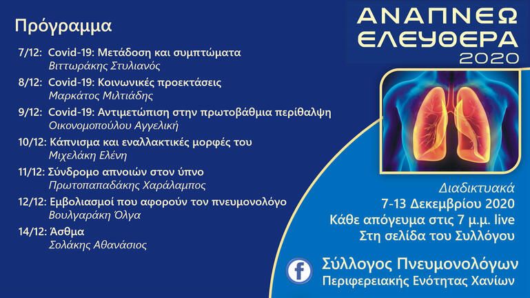 Φέτος, λόγω των συνθηκών, η εκδήλωσή μας θα είναι διαδικτυακή, μέσω του Facebook! Από τη Δευτέρα 7 Δεκεμβρίου έως και τη Δευτέρα 14 Δεκεμβρίου, για 7 ημέρες, κάθε απόγευμα στις 7 θα βρισκόμαστε κοντά σας! Κάθε μέρα και με ένα άλλο θέμα. Κάθε μέρα και με άλλον ομιλητή Χανιώτη πνευμονολόγο.