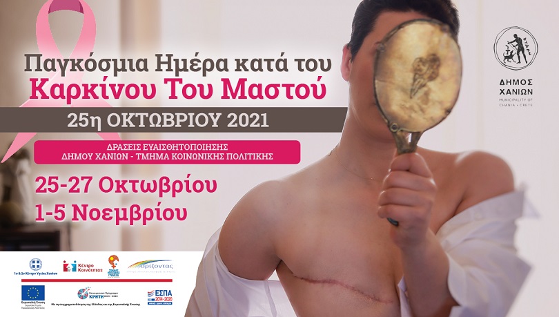 Με κεντρικό μήνυμα «Η καλύτερη θεραπεία είναι η πρόληψη και η έγκαιρη διάγνωση» ο Δήμος Χανίων διοργανώνει σειρά δράσεων, με αφορμή την Παγκόσμια Ημέρα κατά του Καρκίνου του Μαστού, που έχει οριστεί στις 25 Οκτωβρίου, σε συνεργασία με το 1ο και 2ο Κέντρο Υγείας Χανίων, τον Σύλλογο Εθελοντικής Προσφοράς και Στήριξης «Ορίζοντας» και την καλλιτέχνιδα, Μάγδα Βογιατζή.