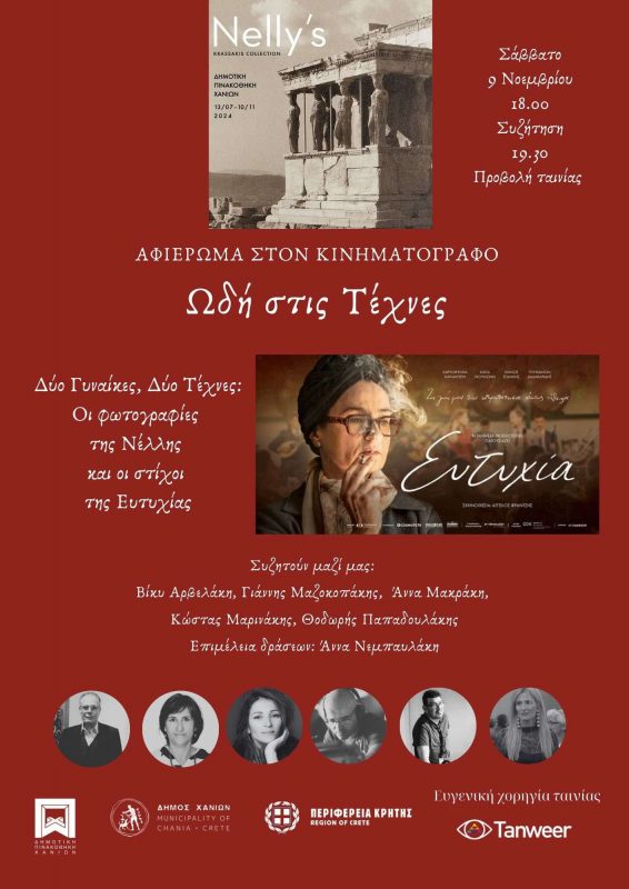 Στο μεταξύ, η Δημοτική Πινακοθήκη Χανίων σας προσκαλεί το Σάββατο 9 Νοεμβρίου στην έβδομη βραδιά της σειράς «Ωδή στις Τέχνες», αφιερωμένης στον κινηματογράφο, για μια μοναδική συνάντηση δύο μεγάλων γυναικείων προσωπικοτήτων του Αϊδινίου, που άφησαν ανεξίτηλο το στίγμα τους στις τέχνες. Τη βραδιά αυτή θα γνωρίσουμε τη ζωή και το έργο της φωτογράφου Νέλλης (Έλλη Σουγιουλτζόγλου-Σεραϊδάρη) και της στιχουργού Ευτυχίας Παπαγιαννοπούλου, δύο δημιουργών που διακρίθηκαν και τόλμησαν να πρωτοπορήσουν. Η εκδήλωση, με τίτλο «Δύο Γυναίκες, Δύο Τέχνες: Η Ματιά της Νέλλης και οι Στίχοι της Ευτυχίας», εντάσσεται στις παράλληλες δράσεις «Ωδή στην Τέχνη», συνοδεύει την έκθεση «Nelly’s – Συλλογή Κρασάκη» και αποτελεί διοργάνωση του Δήμου Χανίων, της Δημοτικής Πινακοθήκης Χανίων και της Περιφερειακής Ενότητας Χανίων.