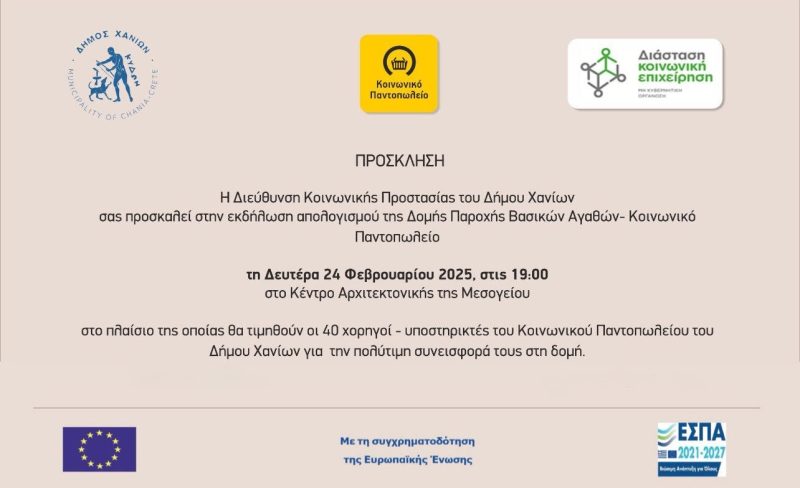 Η Διεύθυνση Κοινωνικής Προστασίας του Δήμου Χανίων διοργανώνει εκδήλωση απολογισμού της Δομής Παροχής Βασικών Αγαθών – Κοινωνικό Παντοπωλείο, τη Δευτέρα 24 Φεβρουαρίου 2025, στις 19.00, στο ΚΑΜ.