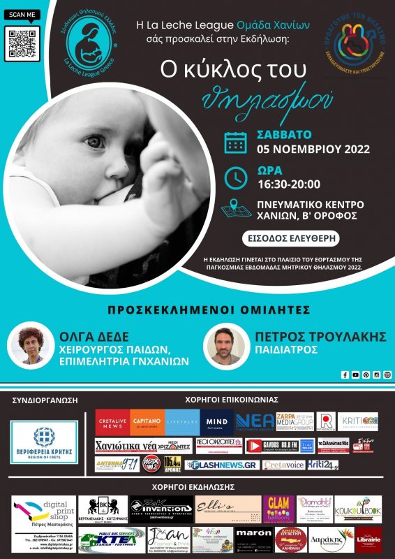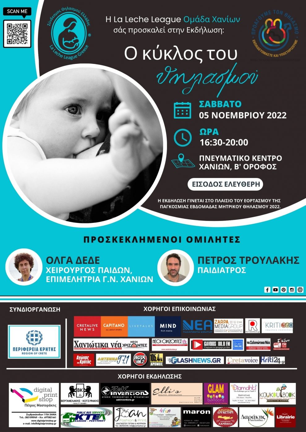 Ο Σύνδεσμος Θηλασμού Ελλάδος – La Leche League Greece1 (προφέρεται Λα Λέτσε Λίγκ), στο πλαίσιο του εορτασμού της Παγκόσμιας Εβδομάδας Μητρικού Θηλασμού 2022, η οποία στη χώρα μας γιορτάζεται την πρώτη εβδομάδα του Νοεμβρίου (01-07 Νοεμβρίου), συνδιοργανώνει με την Περιφέρεια Κρήτης (Περιφερειακή Ενότητα Χανίων), Εκδήλωση Θηλασμού, με τίτλο «Ο κύκλος του θηλασμού», το Σάββατο 5 Νοεμβρίου 2022 και ώρα 16.30-20.00, στο Πνευματικό Κέντρο Χανίων, που βρίσκεται επί της οδού Ανδρέα Παπανδρέου 74, στα Χανιά.