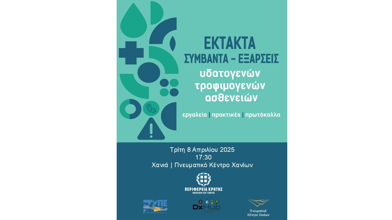 Η Περιφέρεια Κρήτης στο πλαίσιο δράσεων που αφορούν τη Δημόσια Υγεία και ειδικότερα την προστασία του πληθυσμού από την έξαρση κρουσμάτων γαστρεντερίτιδας που καταγράφηκε και τα διαχρονικά προβλήματα από τροφιμογενή και υδατογενή νοσήματα, θα υλοποιήσει την ενημερωτική εκδήλωση με θέμα: «ΕΚΤΑΚΤΑ ΣΥΜΒΑΝΤΑ – ΕΞΑΡΣΕΙΣ ΥΔΑΤΟΓΕΝΩΝ ΚΑΙ ΤΡΟΦΙΜΟΓΕΝΩΝ ΑΣΘΕΝΕΙΩΝ». Η εκδήλωση θα πραγματοποιηθεί την Τρίτη 8 Απριλίου στις 17:30 στο Πνευμα