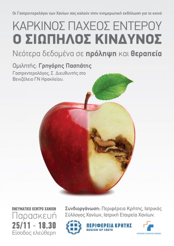 Οι γαστρεντερολόγοι των Χανίων σας καλούν στο Πνευματικό Κέντρο Χανίων, την Παρασκευή 25 Νοεμβρίου, στις 6.30 το απόγευμα, στην εκδήλωση «Καρκίνος του παχέος εντέρου, ο σιωπηλός κίνδυνος».