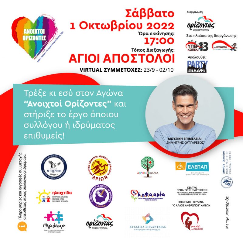 Ξενώνας η «Ηλιαχτίδα», Κέντρο Ημερήσιας Φροντίδας – Απασχόλησης Ατόμων με Αναπηρία Κ.Η.Φ.Α.ΑΜΕΑ, Αθλητικό Σωματείο Ατόμων με Αναπηρία «Αρίων», Κέντρο Πρόληψης των Εξαρτήσεων και Προαγωγής της Ψυχοκοινωνικής Υγείας Περιφερειακής Ενότητας Χανίων, Κέντρο Ημερήσιας Φροντίδας Αυτιστικών Παιδιών «Μεγαλόχαρη», Κέντρο Ημέρας Νόσου Alzheimer Χανίων, Παγκρήτιος Αθλητικός Σύλλογος Κινητικά Ανάπηρων & Παραπληγικών «Αετοί Κρήτης», ΕΛΕΠΑΠ Χανίων, Σύλλογος Γονέων, Κηδεμόνων και Φίλων Ατόμων με Ήπιες Διαταραχές Αυτιστικού Φάσματος – Άσπεργκερ Νομού Χανίων, Συσσίτια Σπλάντζιας, Κοινωνική Κουζίνα «O Άλλος Άνθρωπος» Χανίων, «Η Καρδιά του Παιδιού», Σύλλογος Εθελοντικής Προσφοράς και Στήριξης «Ορίζοντας». Η πρώτη ημέρα θα κλείσει με «Πιλάφι Party», όπου θα μας διασκεδάσει με τις μουσικές επιλογές του ο Δημήτρης Ουγγαρέζος.
