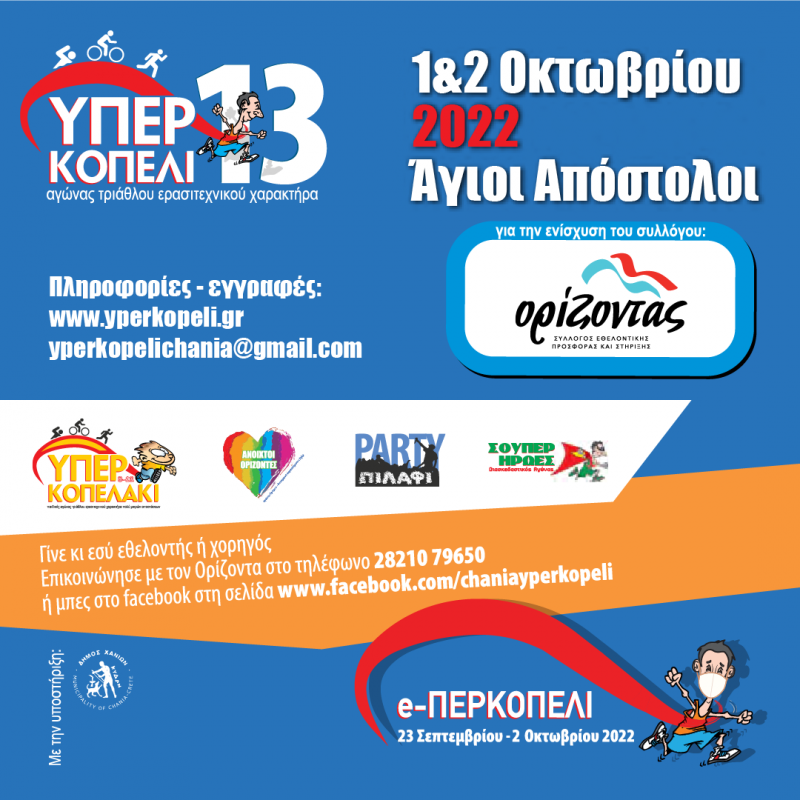 Ο Σύλλογος Ορίζοντας και η αθλητική του παρέα διοργανώνει τα τελευταία 13 χρόνια το «ΥΠΕΡΚΟΠΕΛΙ», για τη στήριξη παιδιών και ενηλίκων που πάσχουν από καρκίνο. Ένα διήμερο γεμάτο με πολλές δράσεις, αθλητικές, ψυχαγωγικές, πολιτιστικές, όλες με πνεύμα αλληλοστήριξης και αλληλεγγύης.