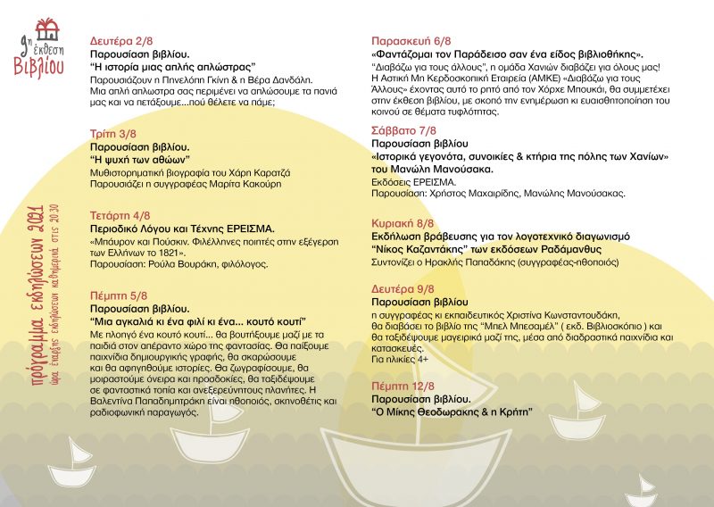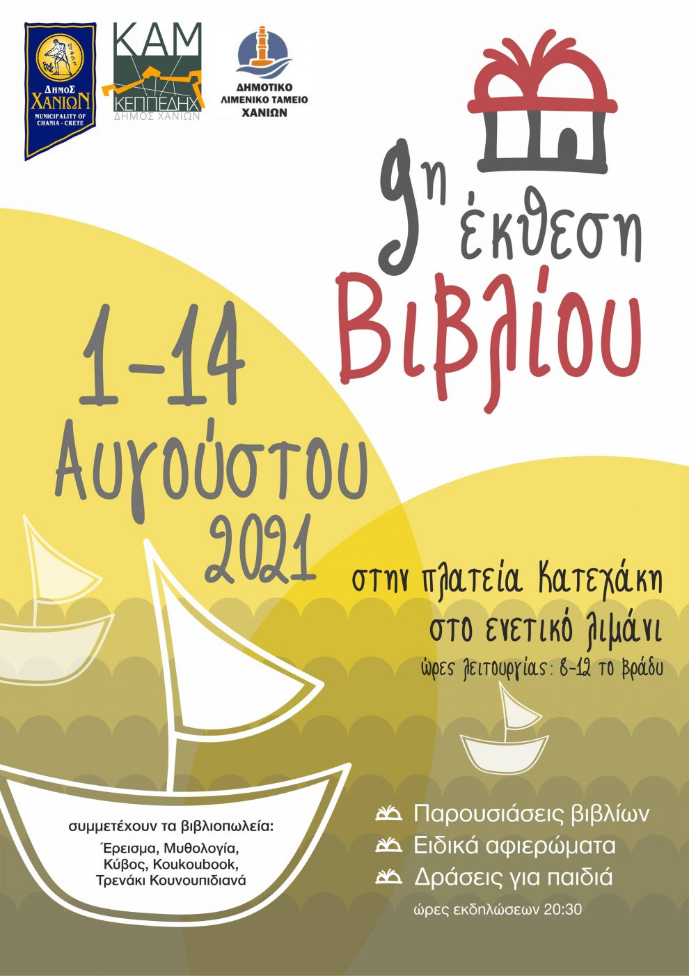 Ο Δήμος Χανίων σε συνεργασία με τα βιβλιοπωλεία της πόλης διοργανώνουν την 9η Έκθεση Βιβλίου από την 1η έωςτις 14 Αυγούστου 2021 στο Ενετικό Λιμάνι των Χανίων, στην πλατεία Κατεχάκη.