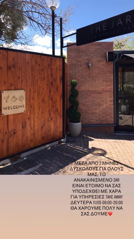 Όπως επισημαίνουν οι ιδιοκτήτες του Γιάννης Μποτωνάκης και Κωνσταντίνος Πάγκαλος “Μετά από δύο μήνες, δύσκολους για όλους μας, το ανακαινισμένο “Jar” είναι έτοιμο να σας υποδεχθεί με χαρά για υπηρεσίες take away από την Δευτέρα 11/5, από τις 9 το πρωί μέχρι τις 8 το βράδυ.