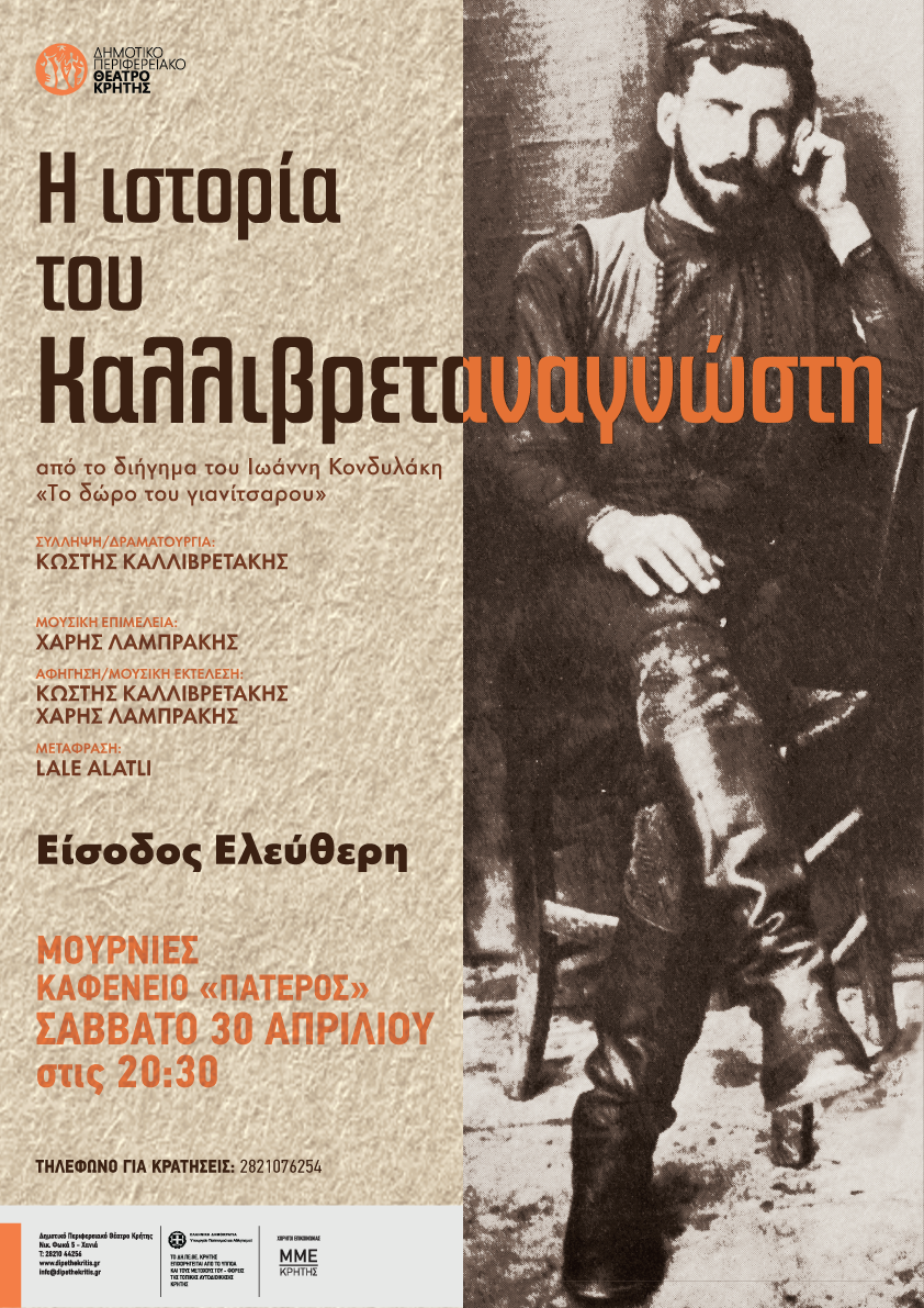 Το Δημοτικό Περιφερειακό Θέατρο Κρήτης παρουσιάζει από την Πέμπτη 28 Απριλίου, το έργο «Η ιστορία του Καλλιβρεταναγνώστη» βασισμένο στο διήγημα του Ιωάννη Κονδυλάκη «Το δώρο του γιανίτσαρου», σε σύλληψη – δραματουργία του Κωστή Καλλιβρετάκη και σε μουσική επιμέλεια του Χάρη Λαμπράκη.