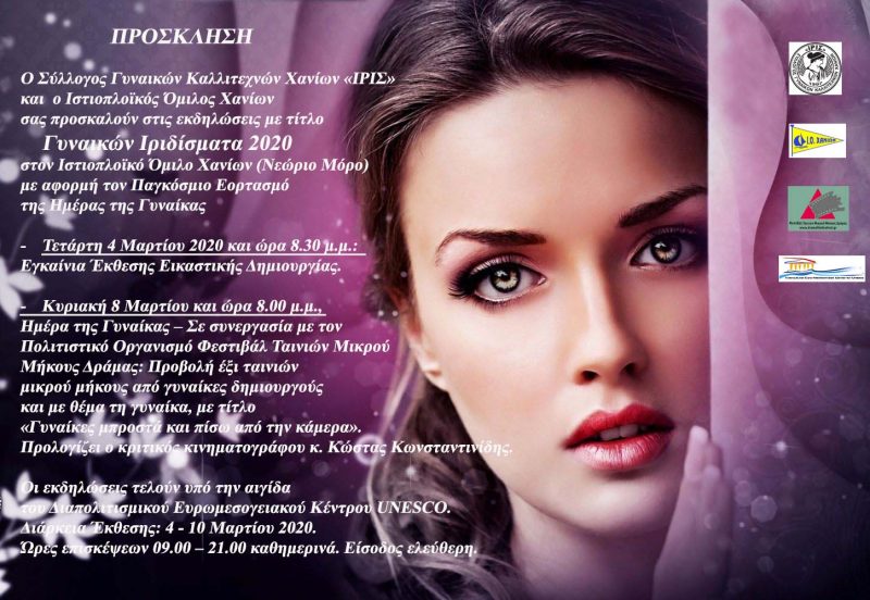 Ο Σύλλογος Γυναικών Καλλιτεχνών Χανίων «ΙΡΙΣ» και  ο Ιστιοπλοϊκός Όμιλος Χανίωνοργανώνουν εκδηλώσεις με τίτλο Γυναικών Ιριδίσματα 2020, στον Ιστιοπλοϊκό Όμιλο Χανίων (Νεώριο Μόρο), με αφορμή τον Παγκόσμιο Εορτασμό της Ημέρας της Γυναίκας: