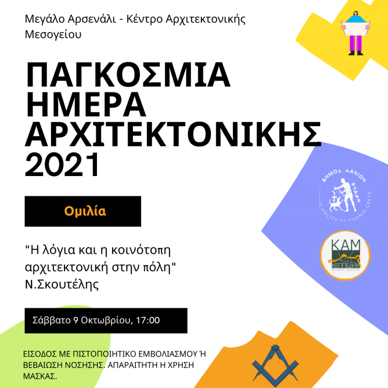 Η Κ.Ε.Π.ΠΕ.ΔΗ.Χ.-Κ.Α.Μ. ολοκληρώνει τις δράσεις για τον εορτασμό της Παγκόσμιας Ημέρας Αρχιτεκτονικής αύριο, Σάββατο 9 Οκτωβρίου 2021, με την ομιλία του Ν. Σκουτέλη, με θέμα: “Η λόγια και η κοινότοπη αρχιτεκτονική στην πόλη”. Η ομιλία θα πραγματοποιηθεί στο Μεγάλο Αρσενάλι, στις 17:00, με ελεύθερη είσοδο.