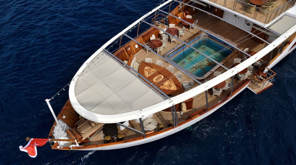 Η βιβλιοθήκη της θαλαμηγού ήταν γεμάτη με έργα Ελλήνων κλασικών συγγραφέων και τα σκαμπό του “μπαρ του Άρη”, όπως το αποκαλούσαν, ήταν καλυμμένα με δέρμα λευκής φάλαινας, ενώ ο πυθμένας της πισίνας υψωνόταν ως το επίπεδο του καταστρώματος και μετατρεπόταν σε πίστα χορού, διακοσμημένη με ψηφιδωτά που απεικόνιζαν σκηνές από την ελληνική μυθολογία.