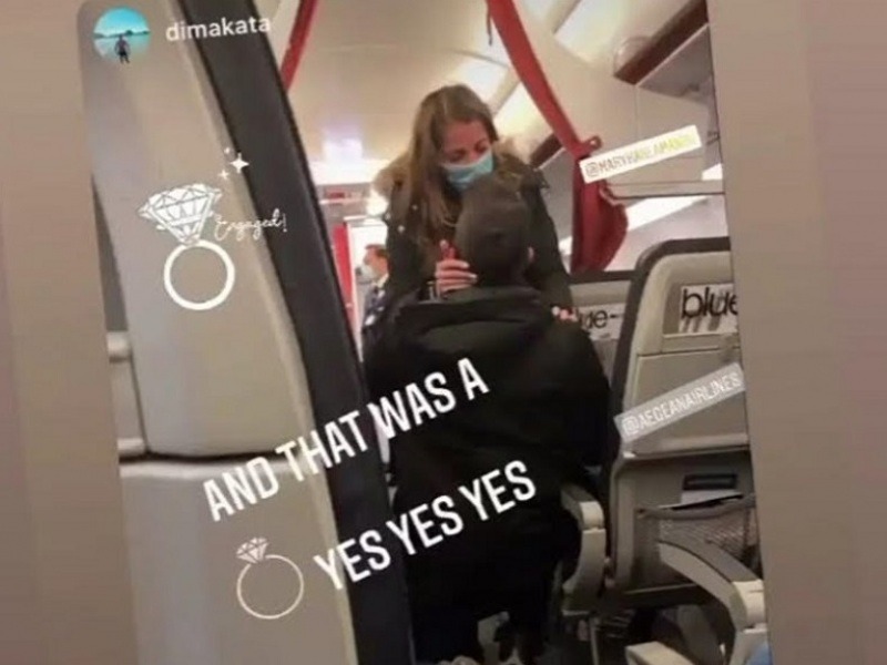 Το ζευγάρι ταξίδευε από την Αθήνα στα Χανιά, όταν ο επιχειρηματίας σηκώθηκε από τη θέση του, γονάτισε μπροστά στην σύντροφό του και της έδωσε το μονόπετρο, ενώ επιβάτες και πλήρωμα του αεροσκάφους ξέσπασαν σε χειροκροτήματα!