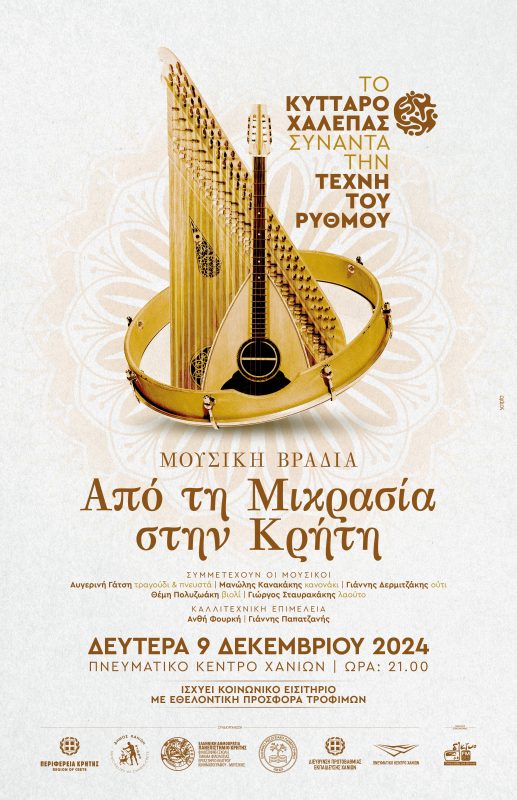 Το εργαστήρι Θεάτρου-Κινηματογράφου-Μουσικής του τμήματος Φιλολογίας του Πανεπιστημίου Κρήτης και το Κύτταρο Χαλέπας σε συνεργασία με την Περιφέρεια Κρήτης, τον Δήμο Χανίων, το ΕΛΜΕΠΑ, το Πνευματικό Κέντρο Χανίων και την Διεύθυνση Πρωτοβάθμιας Εκπαίδευσης Χανίων, σας προσκαλούν στην συναυλία «Από τη Μικρασία στην Κρήτη», τη Δευτέρα 9 Δεκεμβρίου 2024, ώρα 21:00, στο Πνευματικό Κέντρο Χανίων. Η εκδήλωση έχει στόχο την ευαισθητοποίηση της Κοινότητας σε θέματα εθελοντισμού και κοινωνικής αλληλεγγύης.