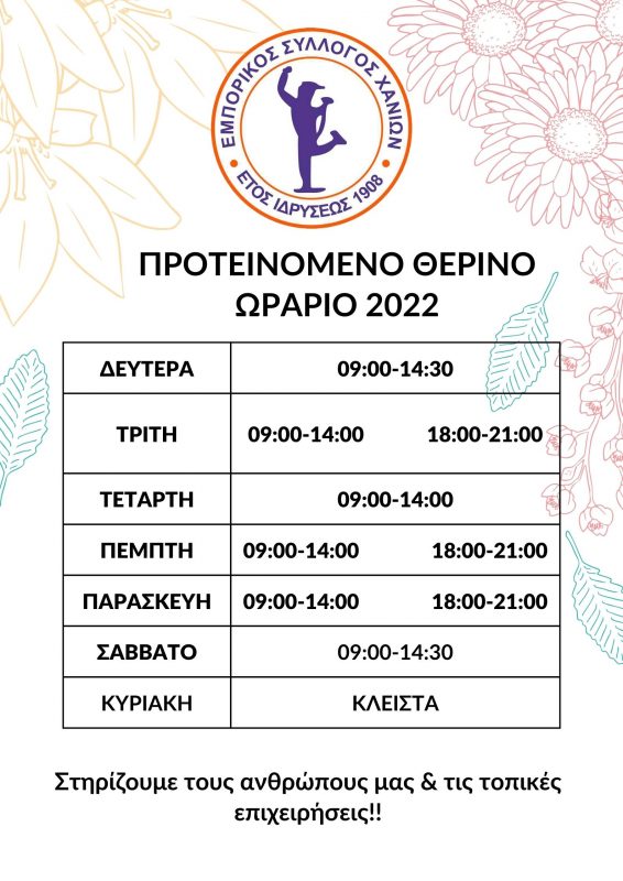 Ο Εμπορικός Σύλλογος Χανίων ανακοινώνει το προτεινόμενο θερινό ωράριο των καταστημάτων που θα ισχύσει από την Παρασκευή 1 Απριλίου 2022 , το οποίο διαμορφώνεται ως εξής: