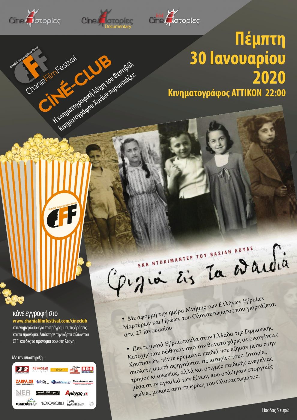 Με αφορμή την ημέρα Μνήμης των Ελλήνων Εβραίων Μαρτύρων και Ηρώων του Ολοκαυτώματος που γιορτάζεται στις 27 Ιανουαρίου, η λέσχη του Φεστιβάλ Κινηματογράφου Χανίων προβάλει την Πέμπτη 30 Ιανουαρίου το συγκλονιστικό ντοκιμαντέρ του Βασίλη Λουλέ “ΦΙΛΙΑ ΕΙΣ ΤΑ ΠΑΙΔΙΑ”, με αφηγήσεις 5 Εβραιόπουλων που σώθηκαν στην Ελλάδα της Γερμανικής Κατοχής.
