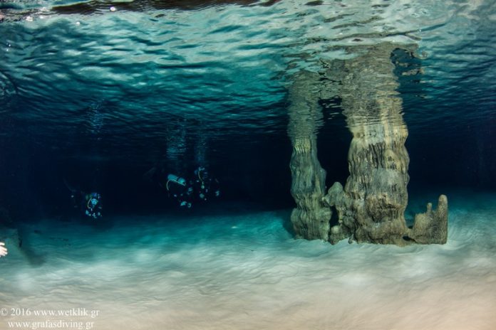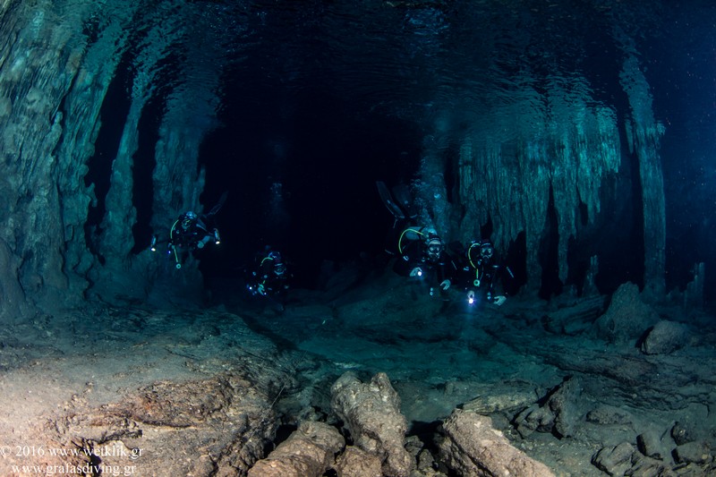 Πρίν το τέλος της διαδρομής ο δύτης εισέρχεται σε ένα άλλο τοπίο. Η ολόλευκη άμμο διαφοροποιεί τις χρωματικές αποχρώσεις κάνοντας την εικόνα εξωπραγματική Στο σπήλαιο υπάρχουν σταλακτίτες και σταλαγμίτες με κοκκινωπό χρώμα το οποίο οφείλεται στην περιεκτικότητα αλουμινίου και σιδήρου. Το γεγονός αυτό όπως και η μελέτη των ιζημάτων αποδεικνύει ότι το σπήλαιο πριν από χιλιάδες χρόνια δεν καλυπτόταν από νερό και ήταν στεγνό.