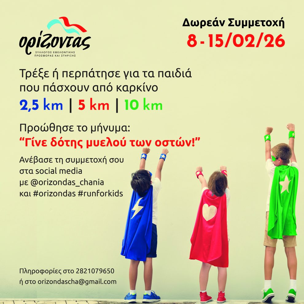 Ο Σύλλογος “Ορίζοντας” με αφορμή την Παγκόσμια Ημέρα κατά του Παιδικού Καρκίνου διοργανώνει συμβολικό Virtual Αγώνα Δρόμου – Δυναμικού Περπατήματος αποστάσεων 2,5χλμ, 5χλμ και 10χλμ, για μικρούς και μεγάλους!