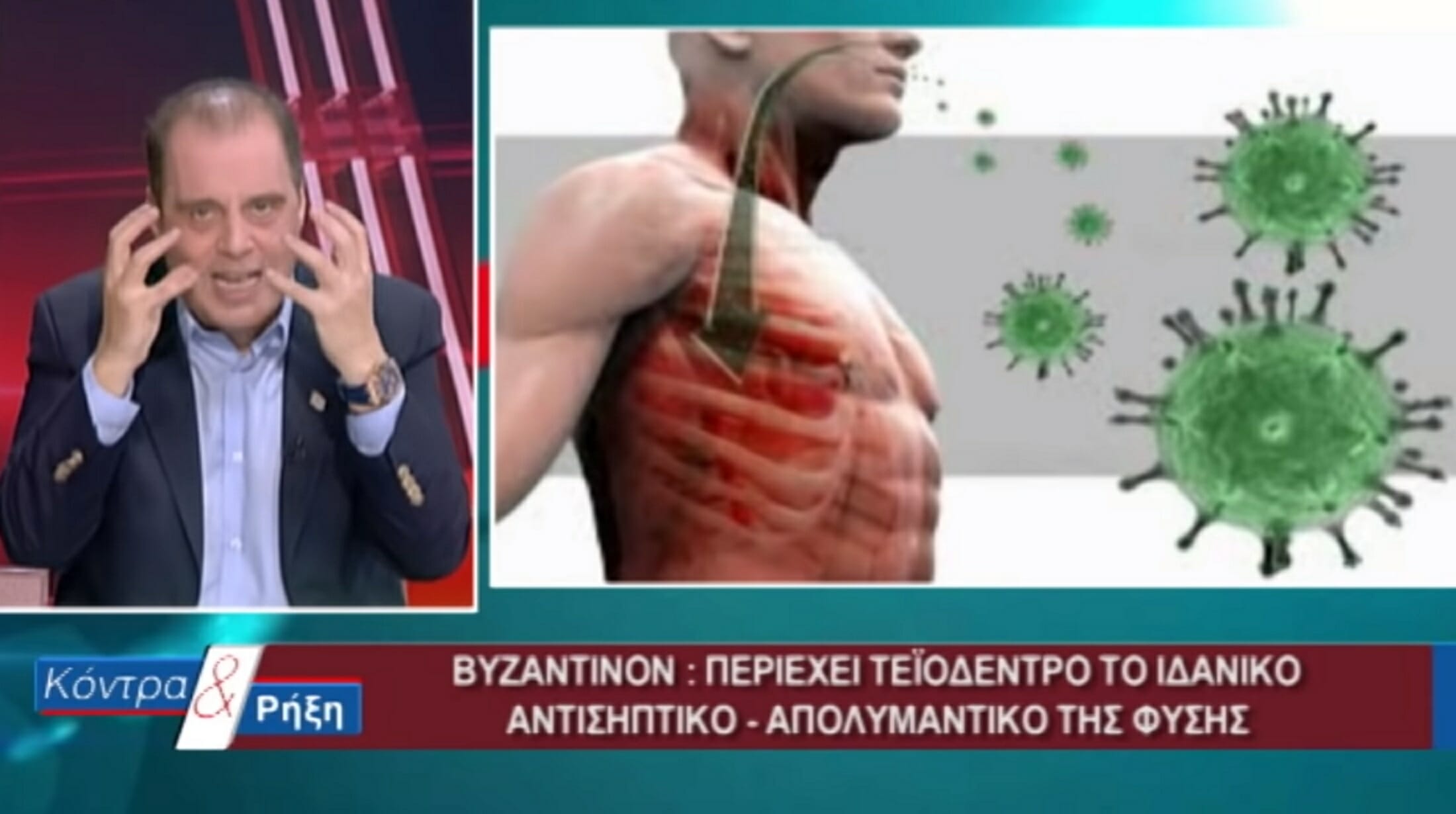 Αναφέρει συγκεκριμένα: “Ο κορονοϊός είναι ένα θέμα. Με την “Βυζαντινόν”, αποτρέπετε κάθε μικρόβια από τα χέρια σας. Είναι φυσικό, φόρμουλα με βότανα μέσα. Μία επάλειψη θα κάνετε το πρωί, μία το μεσημέρι και μία το βράδυ και θα είστε οκ. Μετά μπορείτε να κάνετε και 17 χειραψίες. Έχει μέσα ένα κοκτέιλ ουσιών. Και κάποια από τα βότανα υπάρχουν μόνο στην Αυστραλία. Ούτε να φοβάσαι τον κορονοϊό. Ούτε τίποτα. Έχει από τα λίγα βότανα που είναι δυσεύρετα. Ούτε κορονοϊό, ούτε να φοβάστε ιώσεις, ούτε βακτήρια ούτε να φοβάστε τίποτα».