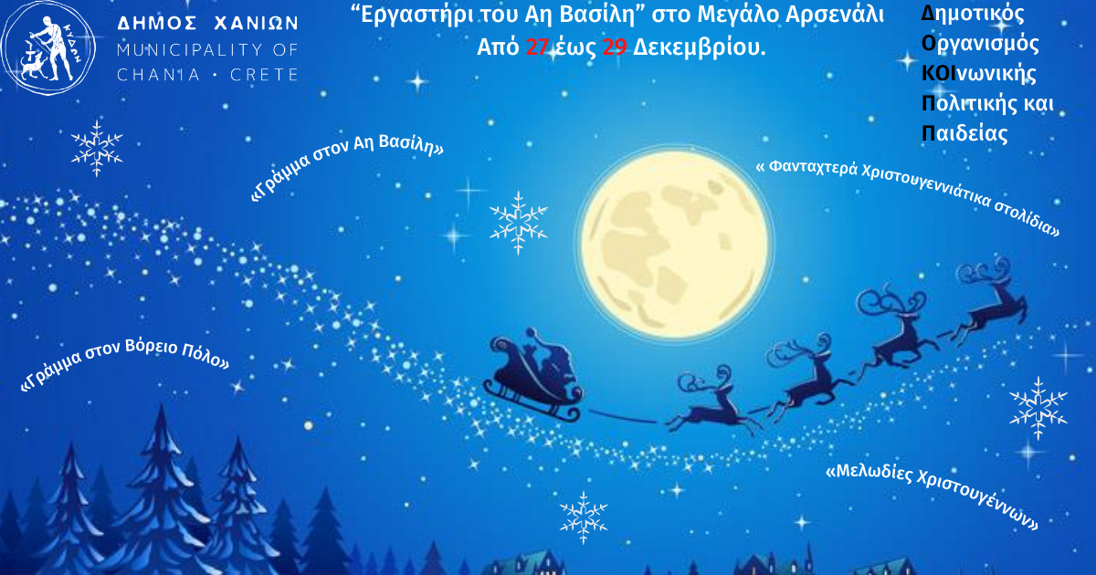 Ένα πλούσιο χριστουγεννιάτικο πρόγραμμα γεμάτο εκπλήξεις, χαρά, μουσική, διασκέδαση και δημιουργία περιμένει τα παιδιά, που θα επισκεφθούν το “Εργαστήρι του Άη Βασίλη” στο Μεγάλο Αρσενάλι από τις 27 έως τις 29 Δεκεμβρίου 2021.