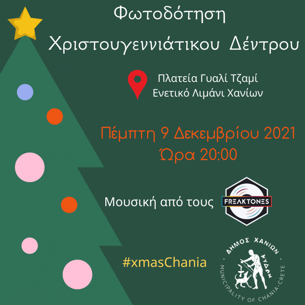 Η φωτοδότηση του νέου Χριστουγεννιάτικου δέντρου στην πλατεία δίπλα από το Γιαλί Τζαμί θα πραγματοποιηθεί σήμερα, Πέμπτη 09 Δεκεμβρίου 2021, στις 20.00, δίνοντας το σύνθημα για την επίσημη έναρξη των εορταστικών εκδηλώσεων, που διοργανώνουν ο Δήμος Χανίων, η Κ.Ε.Π.ΠΕ.ΔΗ.Χ. – Κ.Α.Μ. και το Δημοτικό Λιμενικό Ταμείο Χανίων.
