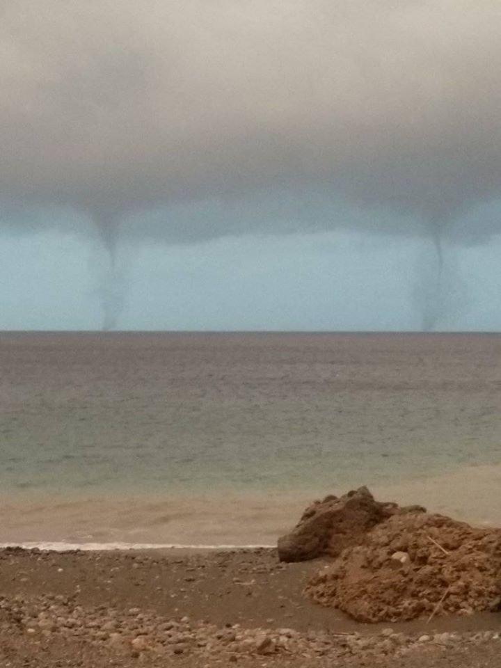Aπό την πρωινή καταιγίδα που πέρασε από την δυτική Κρήτη προκλήθηκαν και υδροστρόβιλοι στα νοτιοδυτικά όπως αυτοί που φαίνονται στην φωτο του κ. Στέλιου Ταπεινάκη από την περιοχή στο Στόμιο – Λειβάδια – Λαφονήσι.