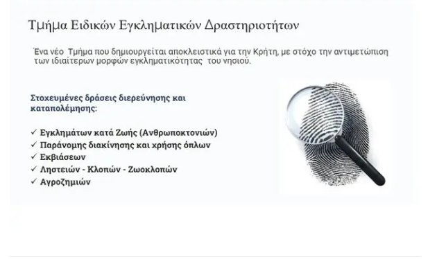 Όπως εξήγησε ο υπουργός, το Τμήμα Ειδικών Εγκληματικών Δραστηριοτήτων δημιουργείται αποκλειστικά στην Κρήτη και θα κάνει στοχευμένες δράσεις διερεύνησης και καταπολέμησης εγκλημάτων κατά ζωής, ανθρωποκτονιών, παράνομης διακίνησης όπλων, εκβιάσεων, ληστειών, κλοπών, ζωοκλοπών και αγροζημιών.