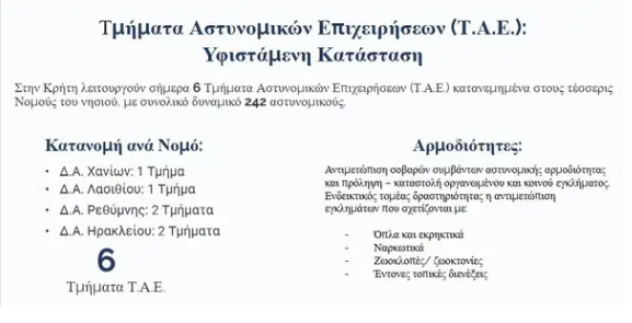 Ο κ. Χρυσοχοΐδης υπενθύμισε ότι η Κρήτη διαθέτει ήδη έξι Τμήματα Αστυνομικών Επιχειρήσεων (ΤΑΕ), τα οποία ιδρύθηκαν πριν από 25 χρόνια και σήμερα αριθμούν 240 αστυνομικούς.