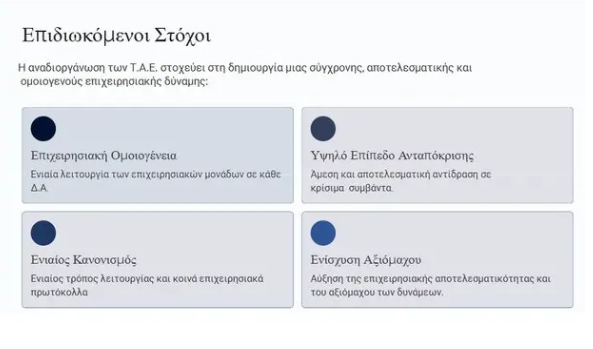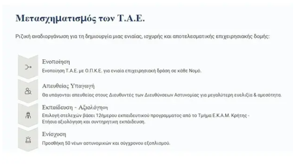 Σήμερα προχωράμε στον μετασχηματισμό των ΤΑΕ με τη ριζική αναδιοργάνωση και τη δημιουργία μιας ενιαίας ισχυρής επιχειρησιακής δομής, συνέχισε. Ενωποιούνται έτσι τα ΤΑΕ με τις ομάδες ΟΠΚΕ (Ομάδες Πρόληψης και Καταστολής Εγκληματικότητας), δημιουργώντας μια ενιαία, πιο ευέλικτη και επιχειρησιακά ισχυρή δύναμη.