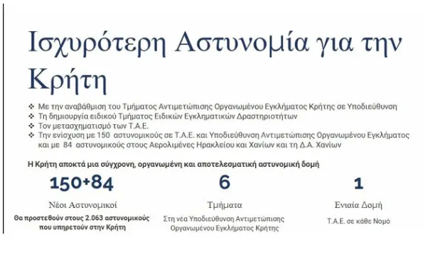 Η νέα αυτή δομή, σύμφωνα με τον υπουργό, θα έχει ενισχυμένο ρόλο στις στοχευμένες επιχειρήσεις κατά του οργανωμένου εγκλήματος, της οπλοκατοχής, των ζωοκλοπών και των εκβιασμών, ενώ θα συνεργάζεται άμεσα με τη νέα Υποδιεύθυνση Ασφάλειας Κρήτης.